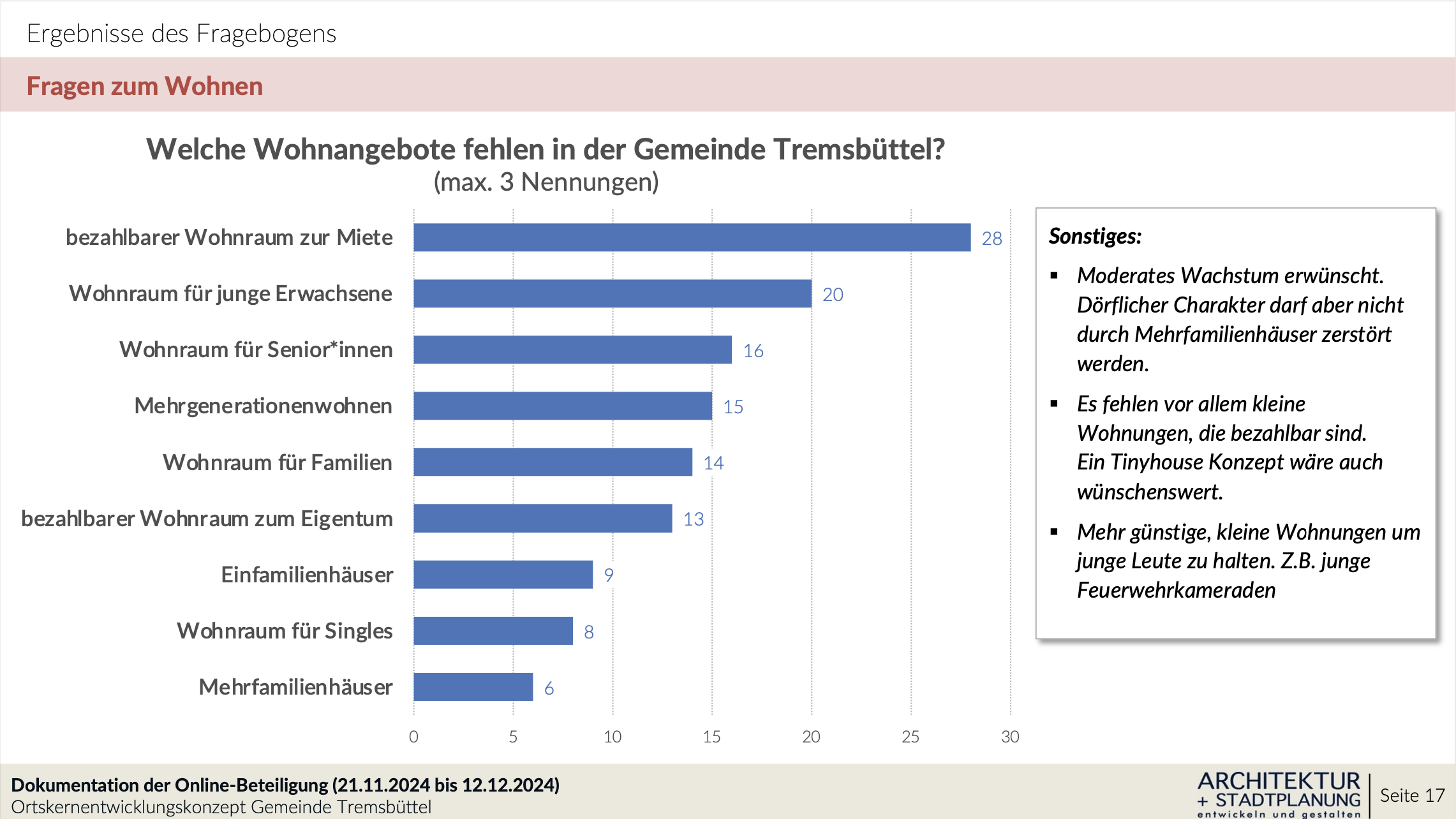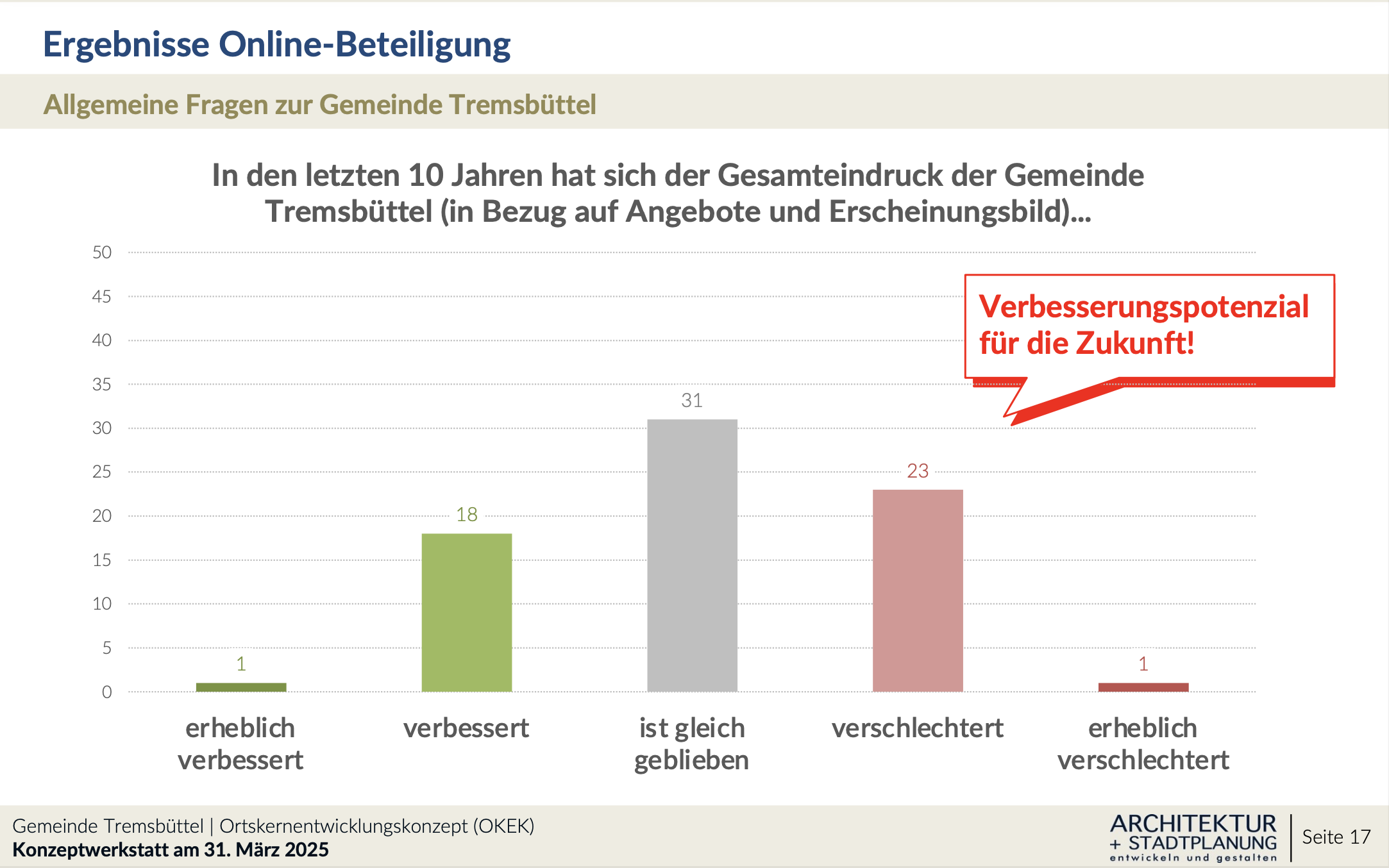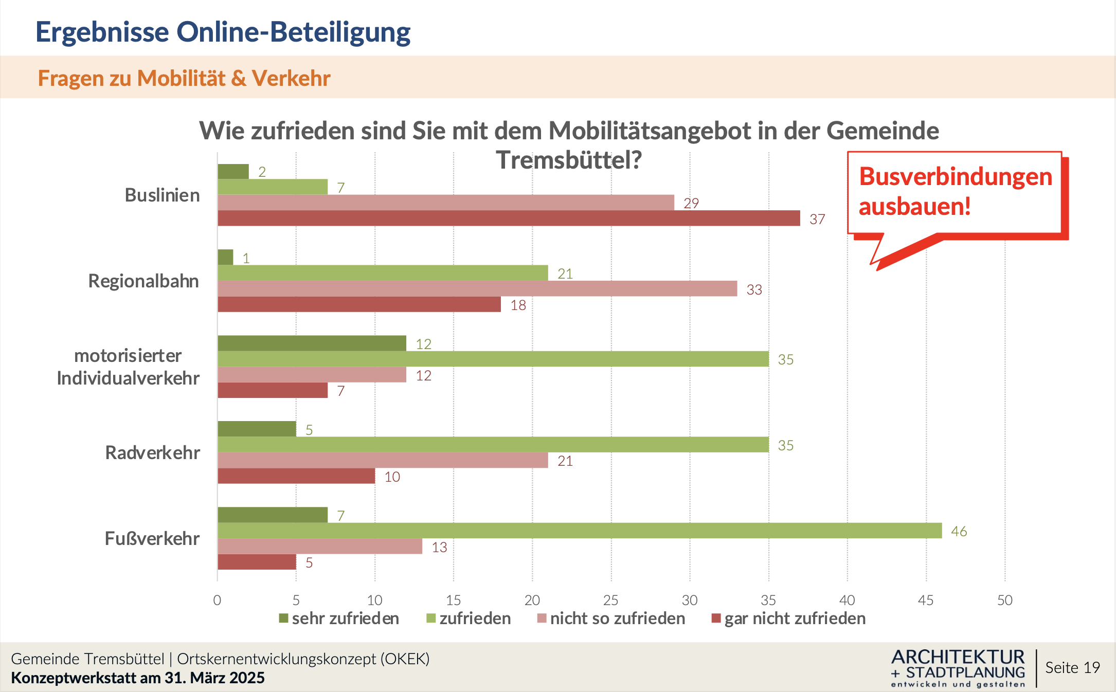 Für das Ortskernentwicklungskonzept der Gemeinde Tremsbüttel fand vom 21.11.2024 bis zum 12.12.2024 eine Onlinebeteiligung in Form eines Fragebogens zu den Themen