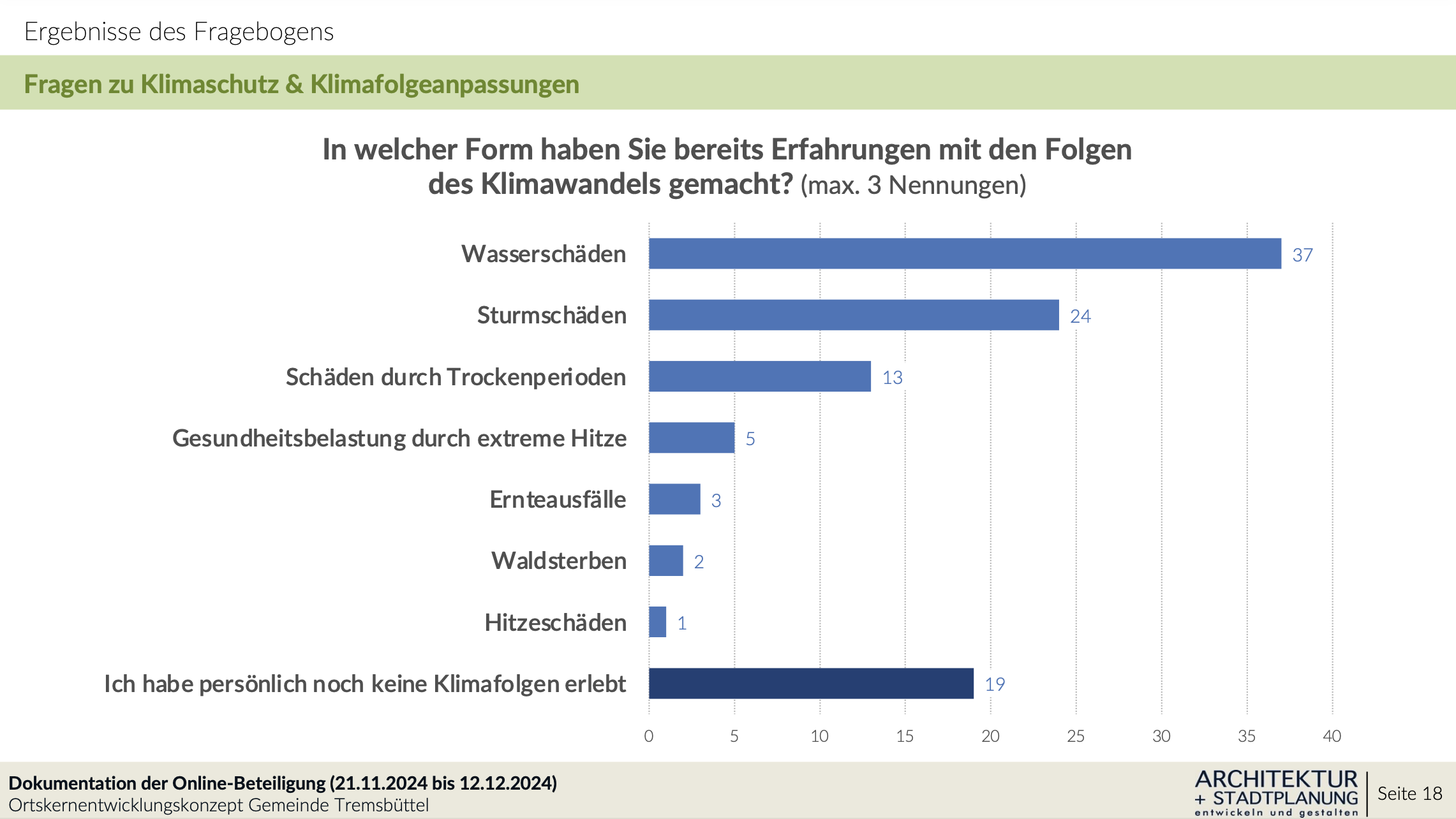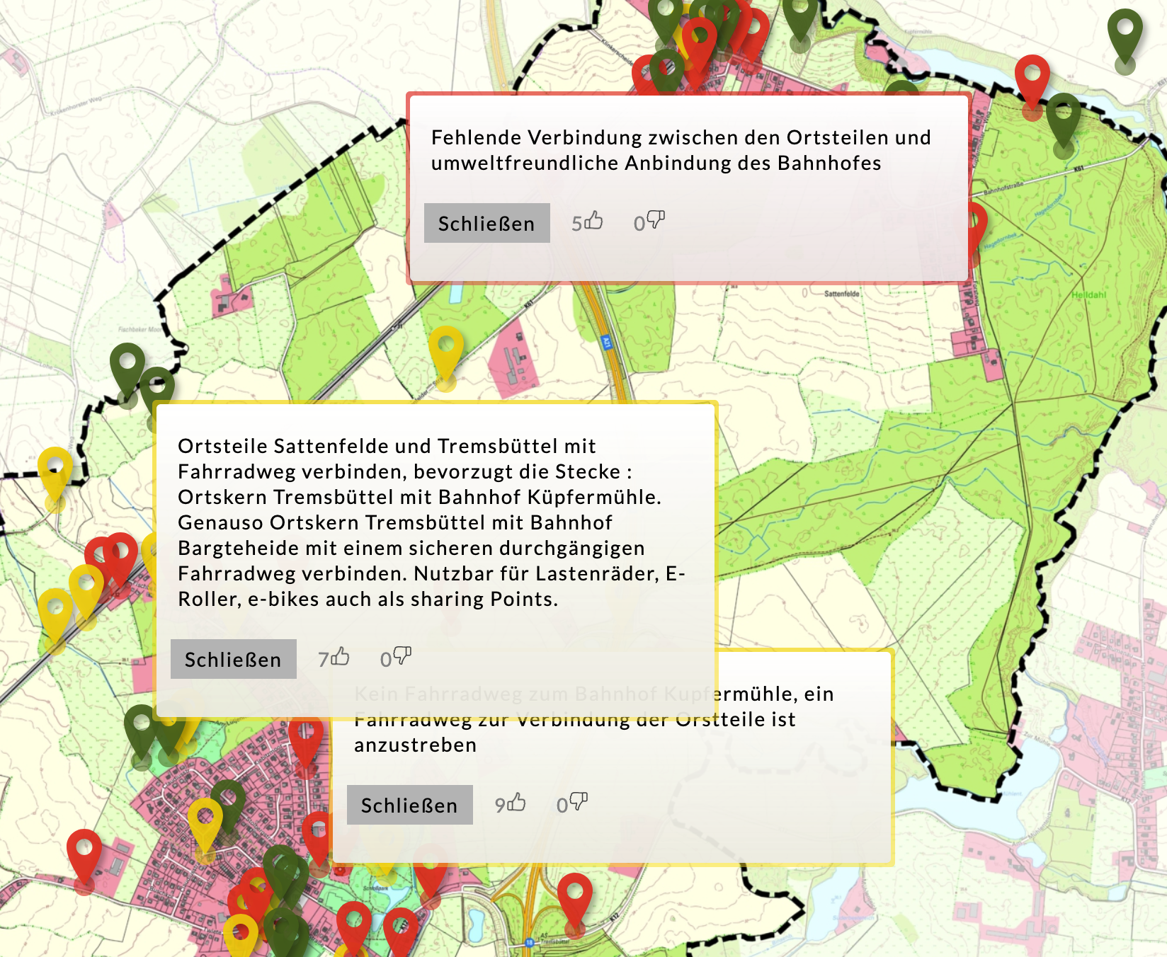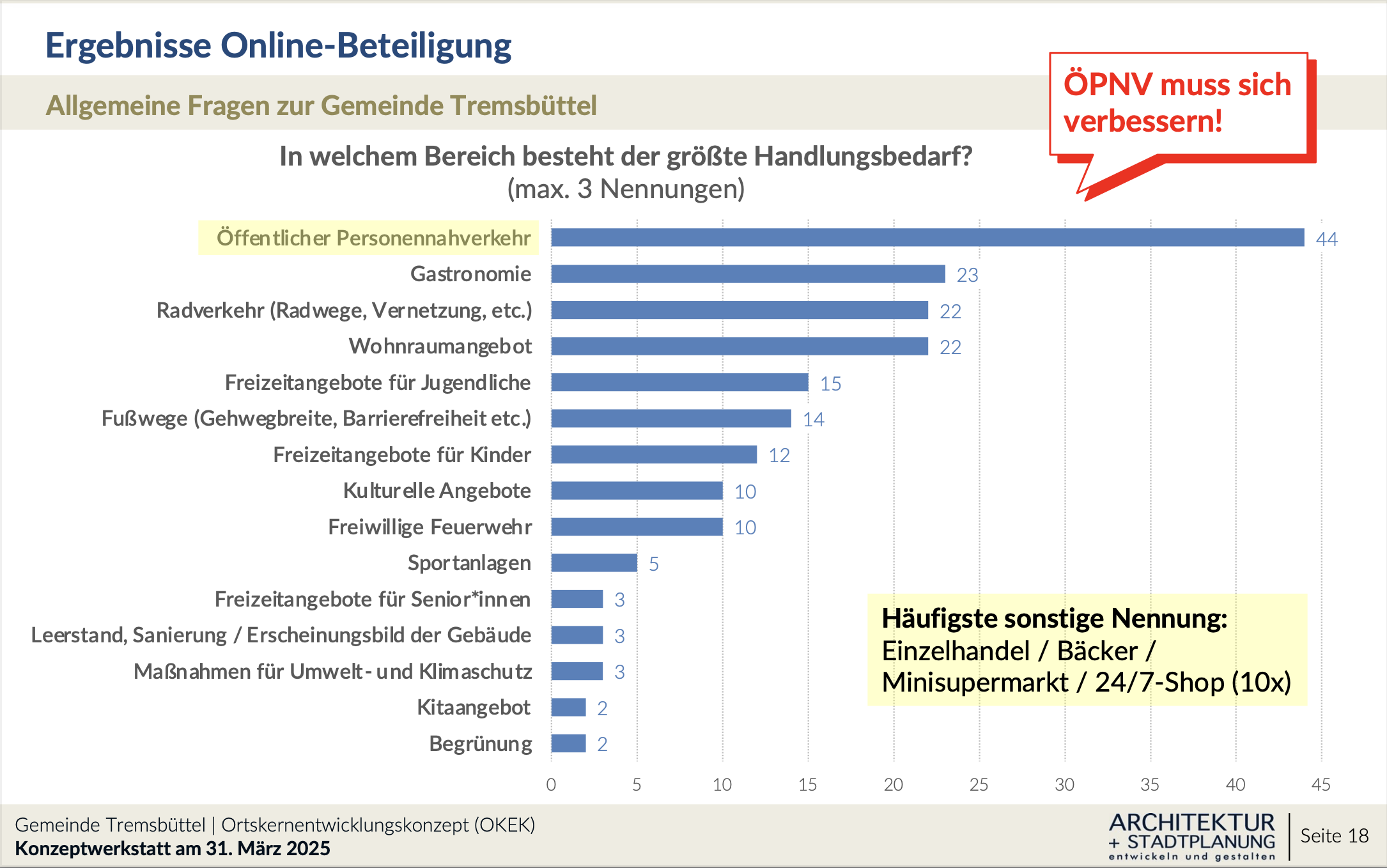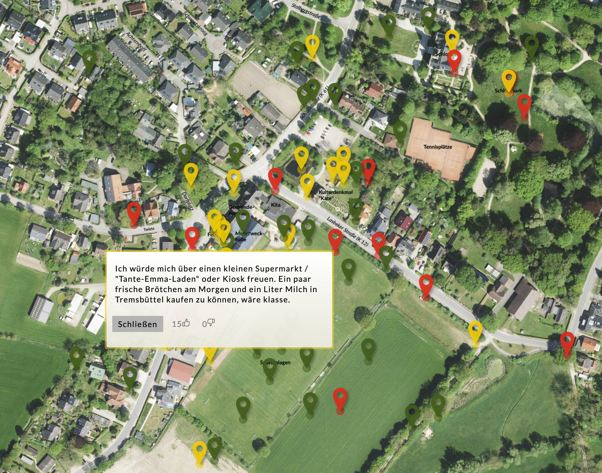 Für das Ortskernentwicklungskonzept der Gemeinde Tremsbüttel fand vom 21.11.2024 bis zum 12.12.2024 eine Onlinebeteiligung in Form eines Fragebogens zu den Themen