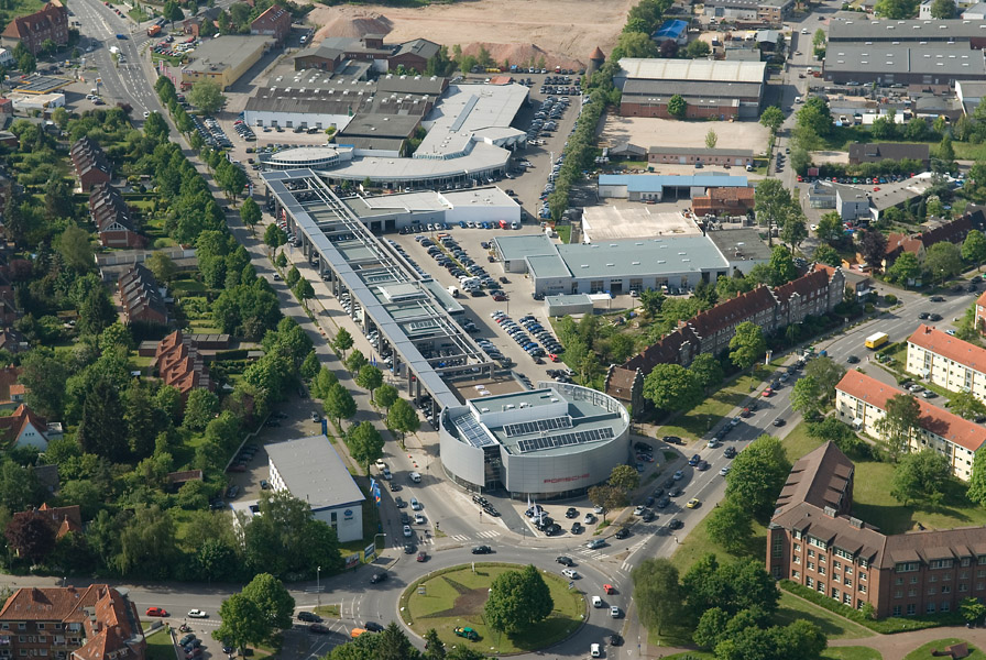 Nach dem Motto „alles unter einem Dach“ entstand entlang der Berliner Straße die Autoarcaden der Kittner Gruppe in Lübeck. Eingebettet in einer signifikanten straßenbegleitenden Randbebauung wurden die verschiedenen Autohäuser Porsche,Volkswagen, Skoda und Toyota gebündelt und in einem Gebäudekomplex gefasst.