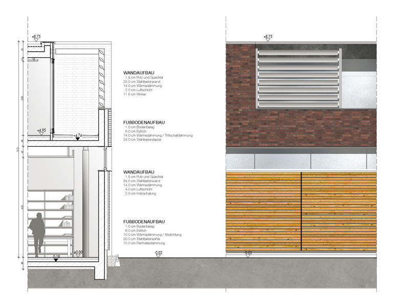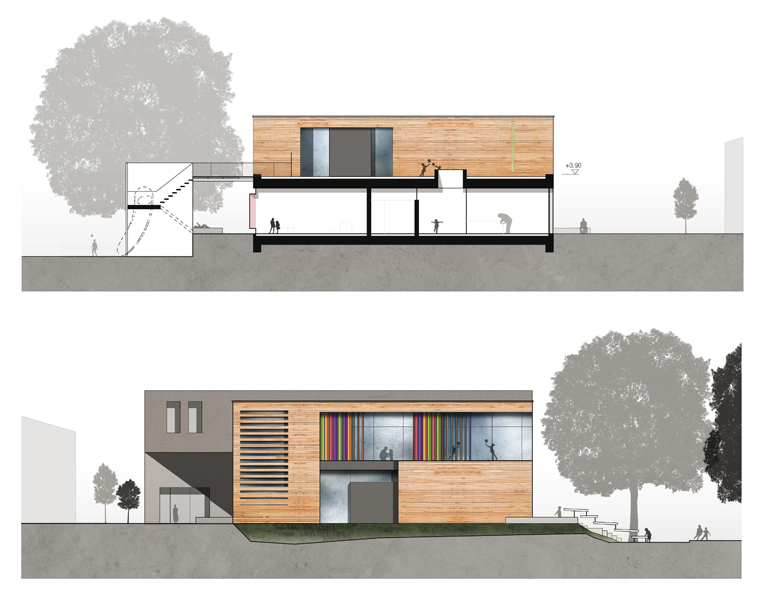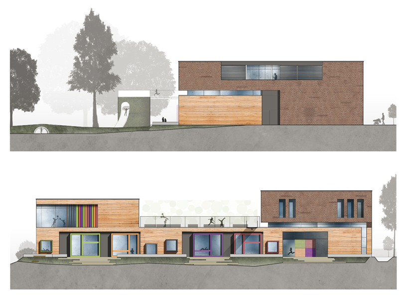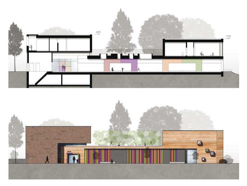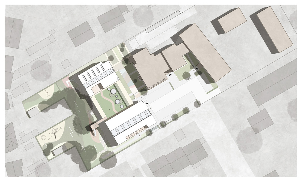 Die Konzeption sieht einen ein- bis zweigeschossigen Baukörper im Westen vor, der orthogonal zum bestehenden Polleyn-Zentrum steht. Durch die Ausbildung zweier Kopfbauten entsteht eine Dachfläche, die eine westliche Blickachse vom Polleynzentrum zulässt, das vorhandene Aussengelände erweitert und eine zusätzliche Spielfläche generiert. Die südliche Kopfausbildung des Familienzentrums stärkt im Gegensatz zum abgängigen Bestandskörper die bestehende Hofsituation und akzentuiert die Haupterschließung, die die Funktionen wie Kindergarten, Diakonie sowie Familienberatung bündelt. Durch die Wiederaufnahme der alten baukörperlichen Nord-Süd Ausrichtung wird die Intimität des vorhandenen Spielraumes und dem öffentlichen Zugangsbereich gewahrt.