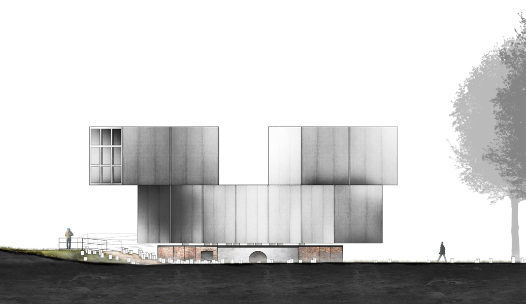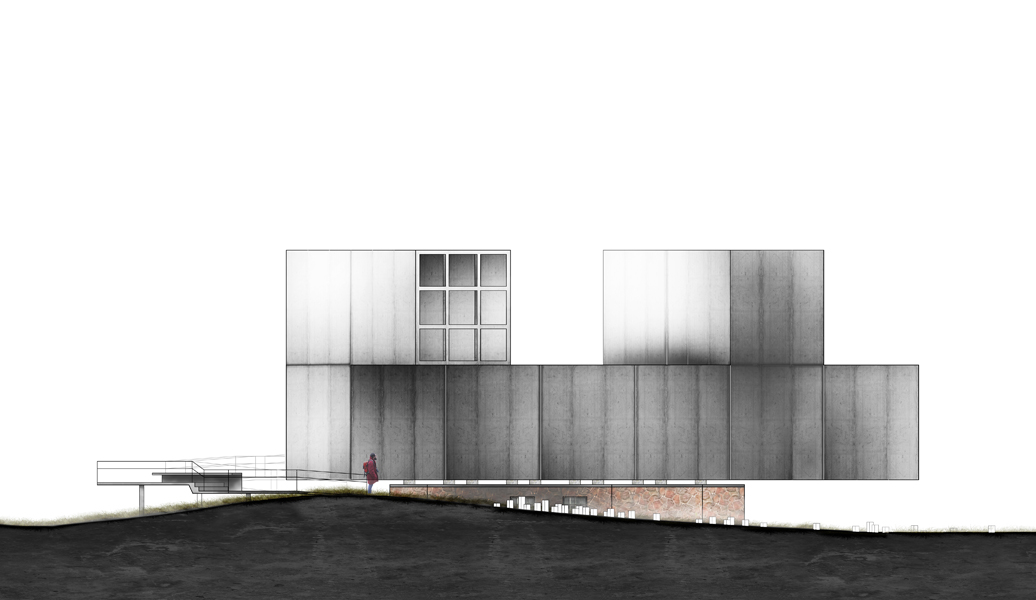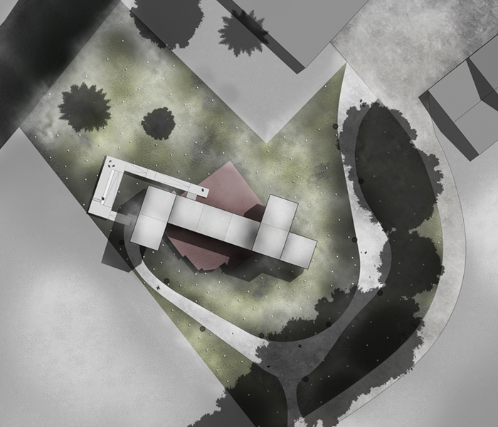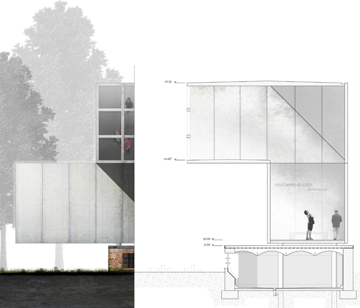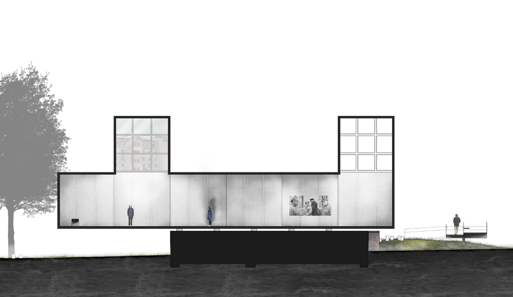 Der Gedenkraum, der als Stahlbetonkörper optisch diagonal über dem Sockel schwebt, wird durch im Raster angeordnete Stützen gegründet.