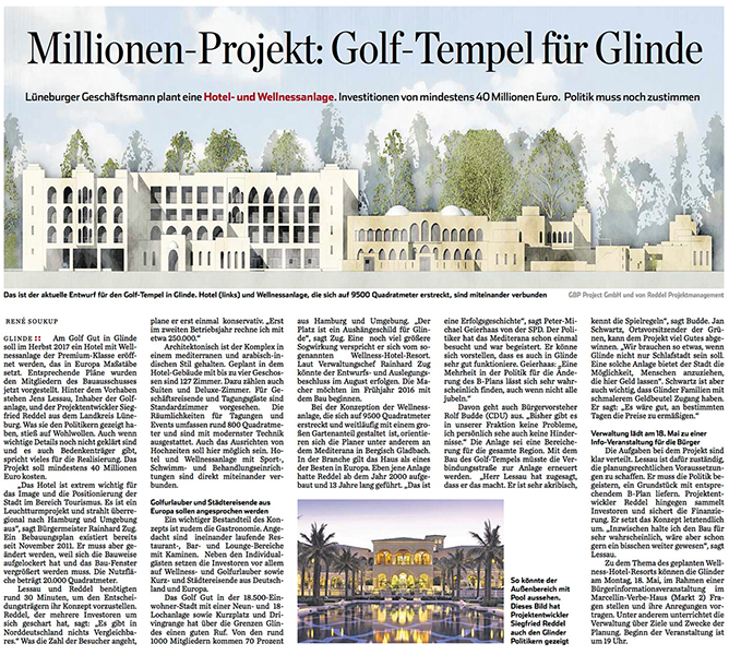 Artikel im Hamburger Abendblatt, 13.05.2015 "Millionen-Projekt: Golf-Tempel für Glinde"