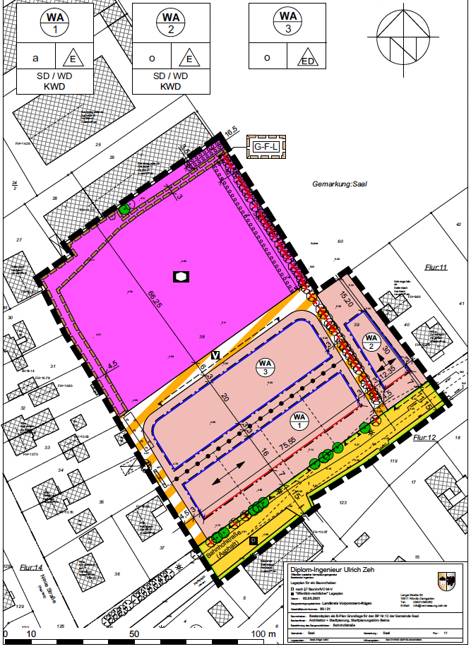 Die Gemeinde Saal plant als Ersatz für die zu kleine Kindertagestätte in Bartelshagen II, die überalterte Kindertagestätte in Saal und den zu kleinen Schulhort in Saal einen gemeinsamen Ersatzneubau auf Flur 11, Flurstück 38 in der Gemarkung Saal. In diesem Zusammenhang hat die Gemeindevertretung der Gemeinde Saal bereits in ihrer Sitzung am 01.12.2020 den „Grundsatzbeschluss zum Ersatzneubau Kindertagesstätte (Kita und Hort) Saal“ beschlossen. In der Gemeinde Saal befinden sich derzeit 3 Kindertagesstätteneinrichtungen. Zwei dieser Einrichtungen werden für die Betreuung von Kita- und Krippenkindern (Saal und Bartelshagen II) und eine Einrichtung zur Betreuung von Hortkindern (Saal) vorgehalten. Diese Einrichtungen entsprechen baulich und technisch nicht mehr dem Stand einer heutigen geführten Kindertagesstätteneinrichtung. Die Umsetzung der pädagogischen Konzeptionen lassen sich nur schwer in den Gebäuden realisieren. Die bestehenden Aufnahmekapazitäten in allen 3 Einrichtungen befinden sich aufgrund der zur Verfügung stehenden Räume und Freiflächen bereits langfristig im Bereich der Kapazitätsgrenze. Die konkreten Bestandszahlen sowie die Prognoseberechnung wurden aufgezeigt und liegen der Gemeinde vor. Die Prognose lässt darauf schließen, dass sich die Kita- und Hortplatzzahlen weiterhin im oberen Bereich befinden werden. Folglich ist aus betreiberseitigen und betriebswirtschaftlichen Gründen notwendig ein neues Konzept für Kindertagesbetreuung Kita und Hort in der Gemeinde Saal zu entwickeln. Im Rahmen der Standortprüfung für eine neue Kindertagesstätte hat sich die Fläche des ehemaligen Sportplatzes im Siedlungsbereich des Hauptortes Saal (hier: östlich der Straße „Neue Straße“, nördlich der Straße „Bahnhofstraße“ als ein potenzieller Standort erwiesen. Aufgrund der Plangebietsgröße von rd. 1,3 ha, d.h. der straßenbegleitenden Länge (hier: Bahnhofstraße) von rd. 110 m sowie der Grundstückstiefe von rd. 120 m, stellt das Areal keine Baulücke im baurechtlichen Sinne dar. Die vorhandene städtebauliche Ordnung (hier: Art und Maß der baulichen Nutzung) ist nicht auf eine derart große Fläche übertragbar, da das Plangebiet keine Baulücke im Sinne des § 34 Abs. 1 BauGB darstellt. Eine Anwendbarkeit des § 34 BauGB ist daher ausgeschlossen. Deshalb ist zur Erlangung des Baurechts die Aufstellung eines qualifizierten Bebauungsplans notwendig. Neben der Kindertagesstätte im nördlichen Bereich des Plangebietes strebt die Gemeinde Saal eine Wohnbebauung für den südlichen Bereich des Plangebietes an. Damit soll der offenkundigen Baulandnachfrage in der Gemeinde begegnet werden.