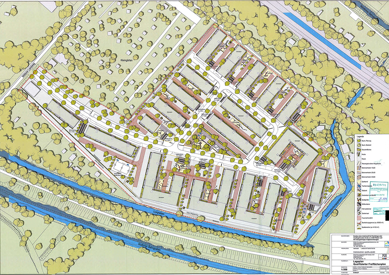 Lageplan und Qualifizierter Freiflächenplan der neuen Wohnsiedlung Gleisdreieck (PGH Planungsgesellschaft Holzbau mbH)